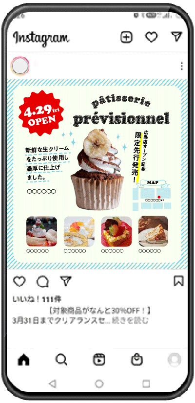 インスタに公式アカウントを開設し、定期的に開催しているレギュラー施策を投稿することで、新聞を購読しておらず、折込チラシでの情報発信が届かない若年層にもリーチすることが可能となります。